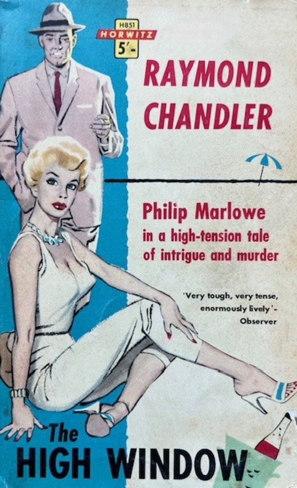 However, the Carter Brown novels were not the publisher’s only output and they released a wide range of books across the spectrum of popular reading from westerns to war stories to romance and books about modern sexual practices. In the early 1960s Horwitz entered into an unusual agreement with Penguin books wherein they released 37 Penguin titles with spiced up covers. One of these was Raymond Chandler’s The High Window (1961). The cover was by noted Australian artist Theo Batten, who also did the one for Playback below.